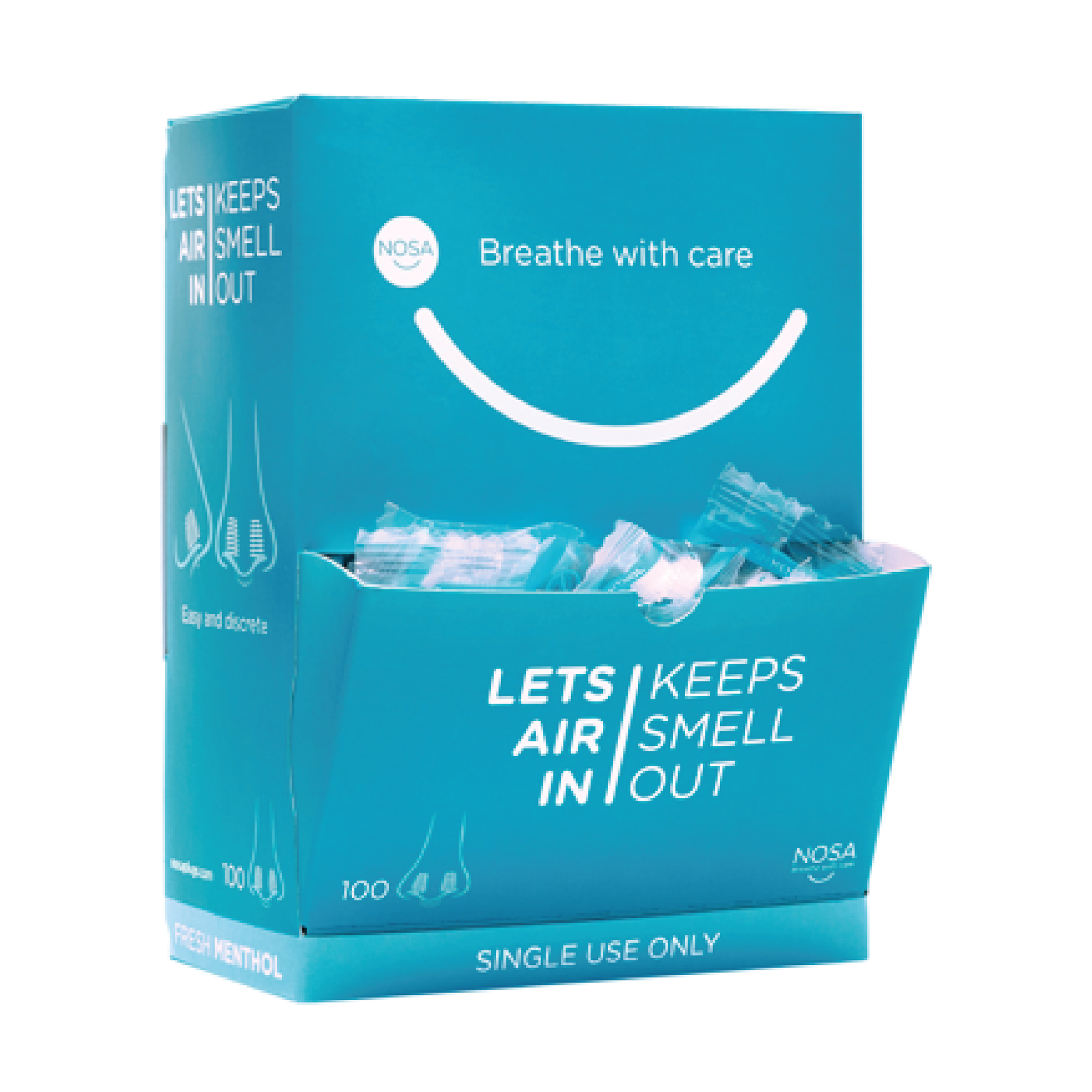 NOSA nasal menthol plugs are a unique patented design that allows air to pass through a spiral, which significantly reduces odours and masks them with a refreshing menthol scent. Easy to breathe through, NOSA menthol plugs can be used continuously for up to 8 hours, providing effective and long–lasting odour control.