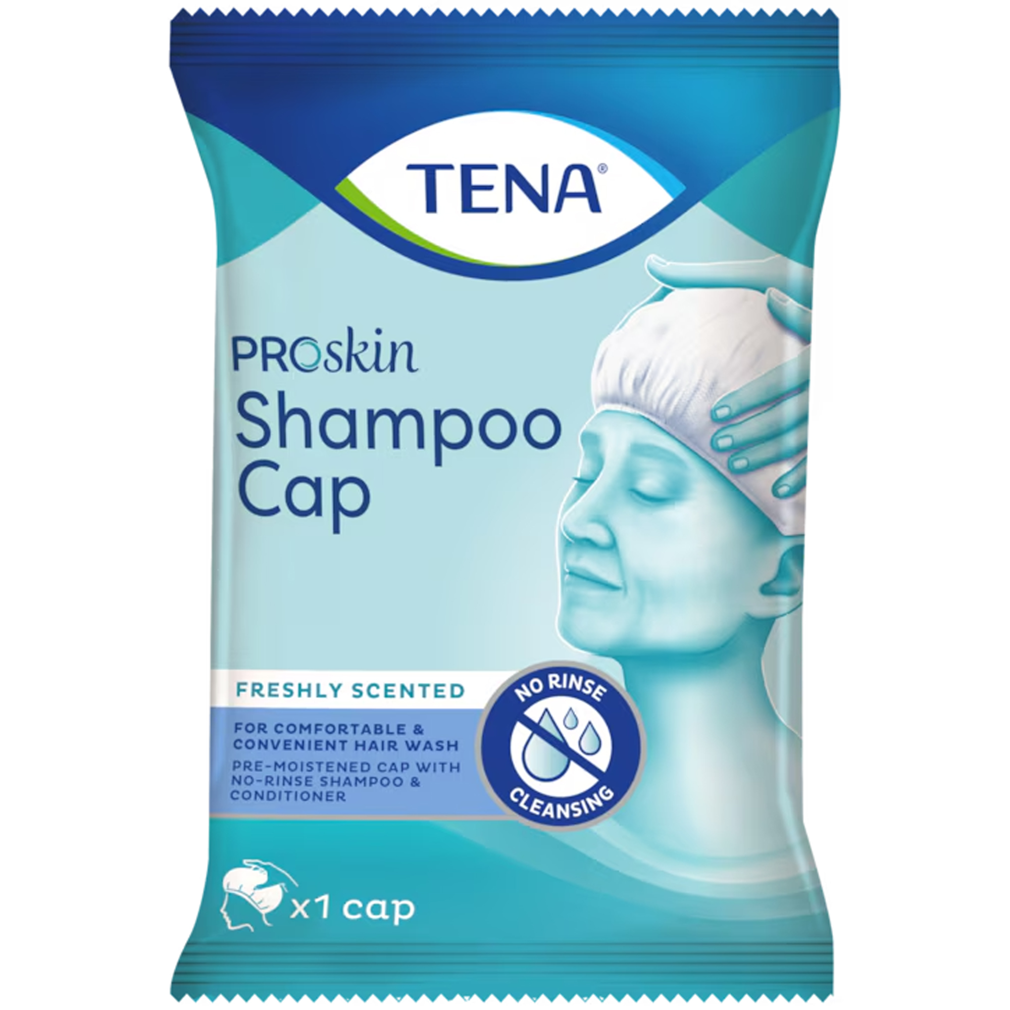 TENA ProSkin Shampoo Cap is a pre–moistened cap with freshly scented shampoo & conditioner for a comfortable and convenient hair wash when regular showering or bathing is a challenge.